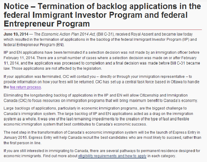 新法案规定:凡在2014年2月11日前,没有获得最终决定的申请案就此终止,也表示“一刀切”生效;如果你的申请属于被终止之列,移民签证处会联系你的代理退回申请费(无息);如果你已经投资,投资款将无息返还。